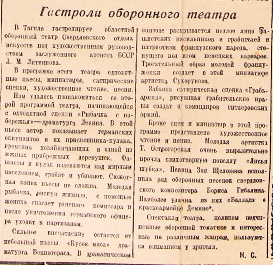 В Тагиле гастролирует «областной оборонный театр Свердловского отдела искусств» под художественным руководством заслуженного артиста БССР Л. М. Литвинова.