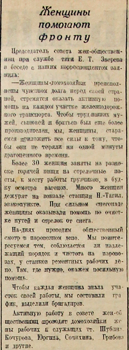 Более 30 женщин заняты на разноске горячей пищи на стрелочные посты, к месту работы грузчиков, в будку осмотра вагонов. Много женщин дежурят на вокзале станции Н.-Тагил, эвакопункте. При сильном снегопаде женщины оказывали помощь по очистке путей и стрелок от снега.