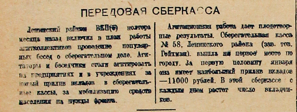 Ленинский райком ВКП(б) полтора месяц назад включил в план работы агитколлективов проведение популярных бесед о сберегательном деле. Агитаторы и беседчики стали агитировать на предприятиях и в учреждениях за новый прилив вкладов в сберегательные кассы, за мобилизацию средств населения на нужды фронта.