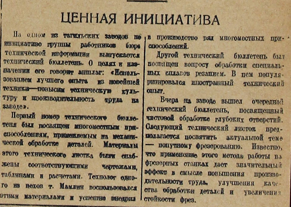 На одном из тагильских заводов по инициативе группы работников бюро технической информации выпускается технический бюллетень. О целях и назначении его говорит аншлаг: «Использованием лучшего опыта из новейшей техники – повысим техническую культуру и производительность труда на заводе».