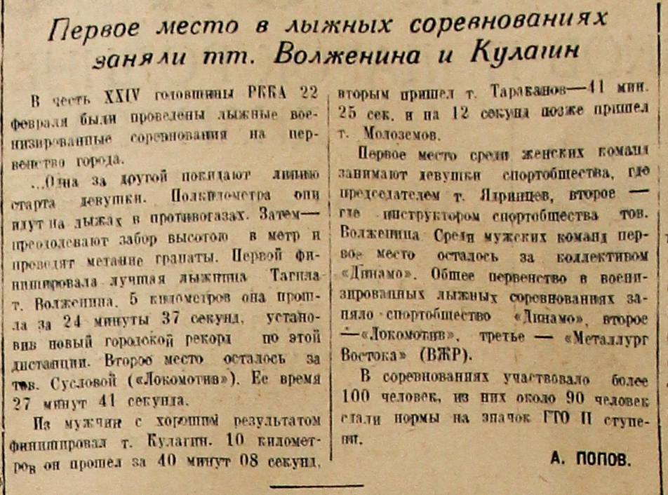 …Одна за другой покидают линию старта девушки. Полкилометра они идут на лыжах в противогазах. Затем – преодолевают забор высотою в метр и проводят метание гранаты. Первой финишировала лучшая лыжница Тагила Т. Волженина. 5 километров она прошла за 24 минуты 37 секунд, установив новый городской рекорд по этой дистанции. Второе место осталось за тов. Сусловой («Локомотив»). Ее время 27 минут 41 секунда.