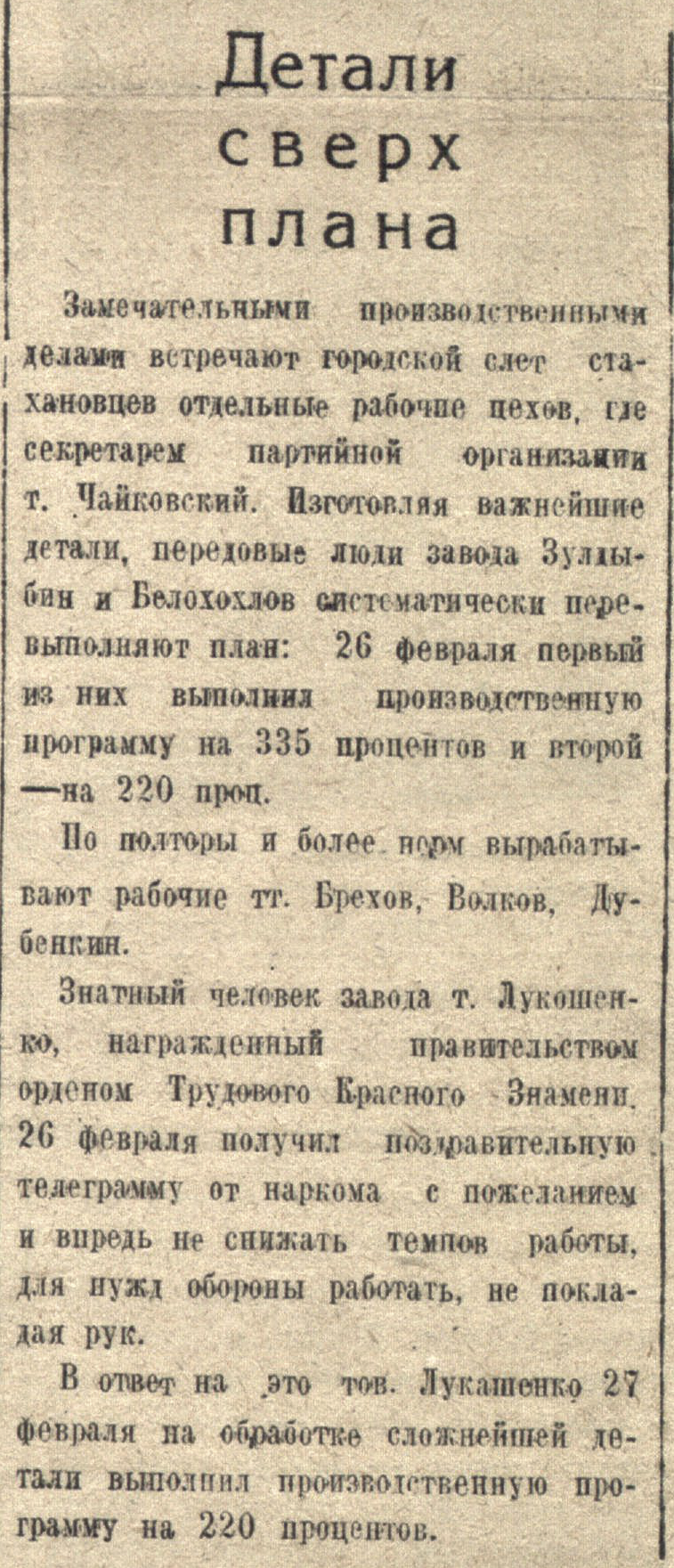 Замечательными производственными делами встречают городской слет стахановцев отдельные рабочие цехов, где секретарем партийной организации т. Чайковский. Изготовляя важнейшие детали, передовые люди завода Зулдыбин и Белохохлов систематически перевыполняют план: 26 февраля первый из них выполнил производственную программу на 335 процентов и второй – на 220 проц.