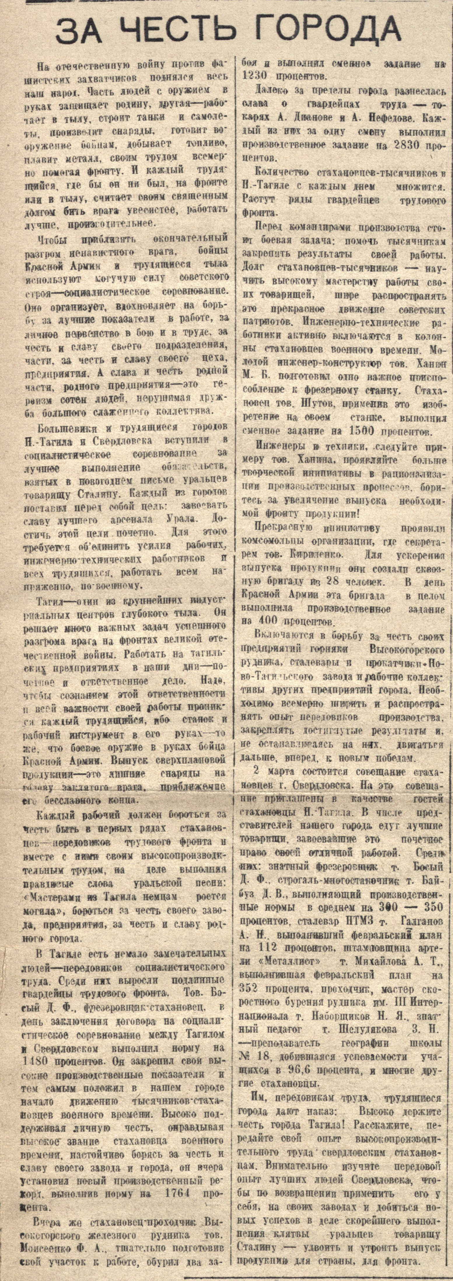 Тагил – один из крупнейших индустриальных центров глубокого тыла. Он решает много важных задач успешного разгрома врага на фронтах великой отечественной войны. Работать на тагильских предприятиях в наши дни – почетное и ответственное дело. Надо, чтобы сознанием этой ответственности и всей важности своей работы проникся каждый трудящийся, ибо станок и рабочий инструмент в его руках – то же, что боевое оружие в руках бойца Красной Армии. Выпуск сверхплановой продукции – это лишние снаряды на голову заклятого врага, приближение его бесславного конца.
