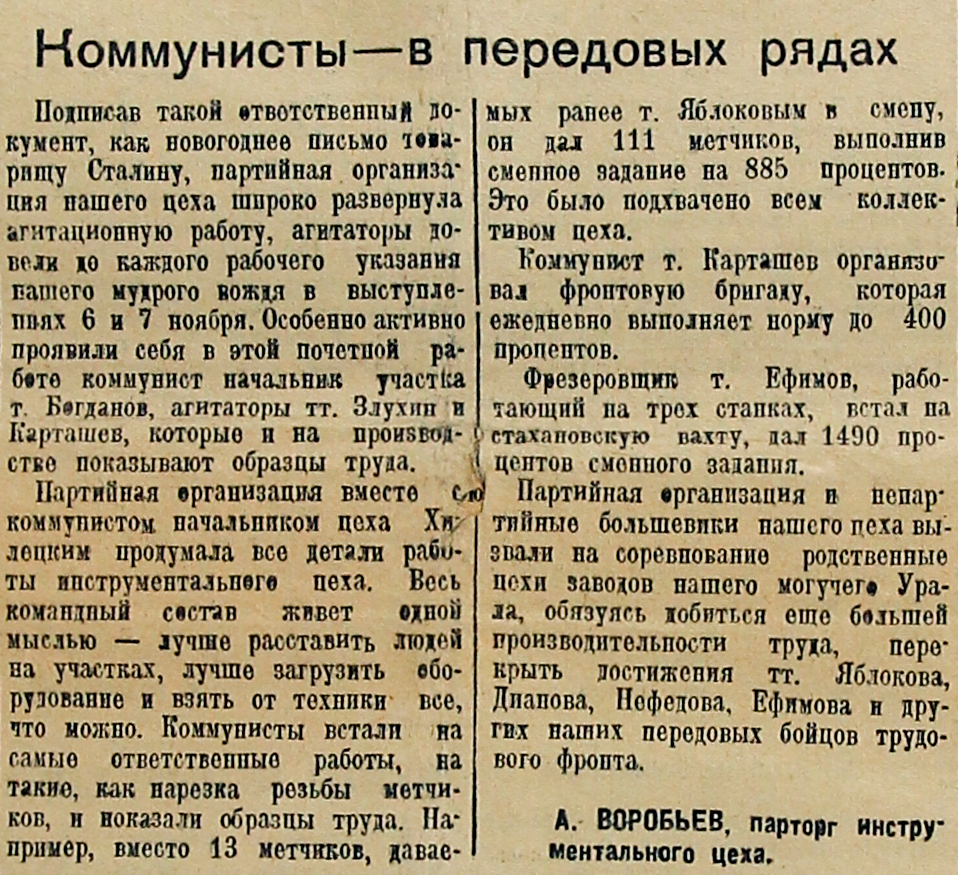 Партийная организация и непартийные большевики нашего цеха вызвали на соревнование родственные цехи заводов нашего могучего Урала, обязуясь добиться еще большей производительности труда, перекрыть достижения тт. Яблокова, Дианова, Нефедова, Ефимова и других наших передовых бойцов трудового фронта.