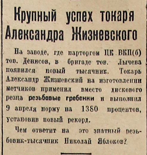 На заводе, где парторгом ЦК ВКП(б) тов. Денисов, в бригаде тов. Лычева появился новый тысячник. Токарь Александр Жизневский на изготовлении метчиков применил вместо дискового резца резьбовые гребенки и выполнил 9 апреля норму на 1380 процентов, установив новый рекорд.