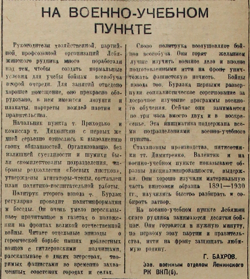 На военно-учебном пункте Лебяжинского рудника занимаются десятки бойцов. Они готовятся в нужную минуту, по первому зову партии и правительства, идти на фронт защищать любимую родину.
