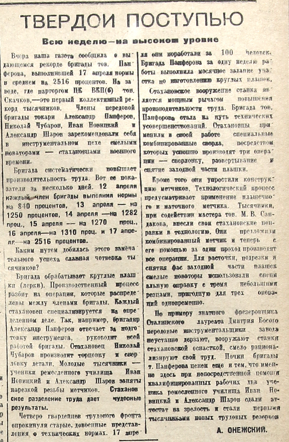 Вчера наша газета сообщила о выдающемся рекорде бригады тов. Панферова, выполнившей 17 апреля нормы в среднем на 2516 процентов. На заводе, где парторгом ЦК ВКП(б) тов. Скачков, – это первый коллективный рекорд тысячников. Члены передовой бригады токари Александр Панферов, Николай Чубаров, Иван Новицкий и Александр Шаров зарекомендовали себя в инструментальном цехе смелыми новаторами – стахановцами военного времени.