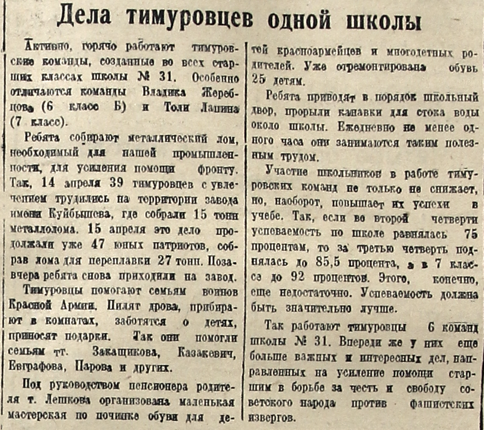 Так работают тимуровцы 6 команд школы № 31. Впереди же у них еще больше важных и интересных дел, направленных на усиление помощи старшим в борьбе за честь и свободу советского народа против фашистских извергов.