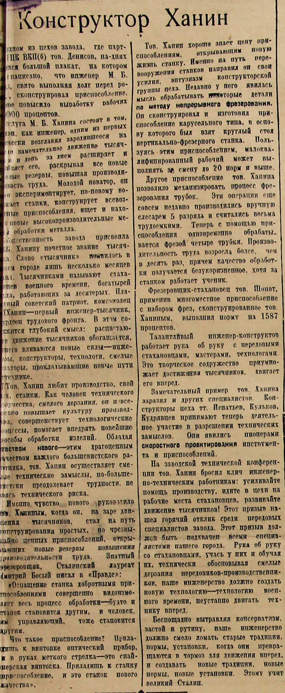 Именно чувство нового руководило тов. Ханиным, когда он, на заре движения тысячников, стал на путь конструирования простых, но чрезвычайно ценных приспособлений, открывающих новые резервы повышения производительности труда. Знатный фрезеровщик, Сталинский лауреат Дмитрий Босый писал в «Правде»: