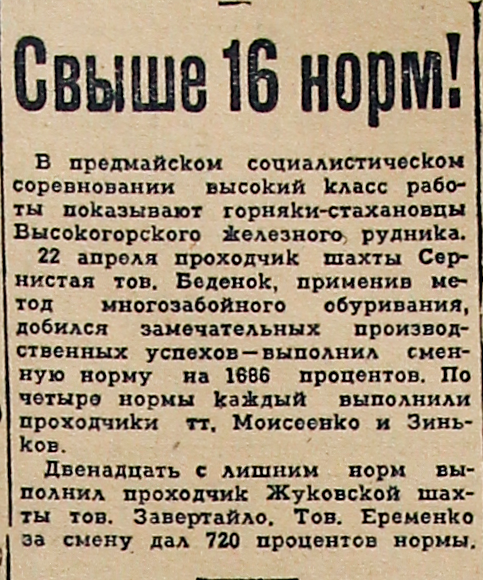 22 апреля проходчик шахты Сернистая тов. Беденок, применив метод многозабойного обуривания, добился замечательных производственных успехов – выполнил сменную норму на 1686 процентов. По четыре нормы каждый выполнили проходчики тт. Моисеенко и Зиньков.