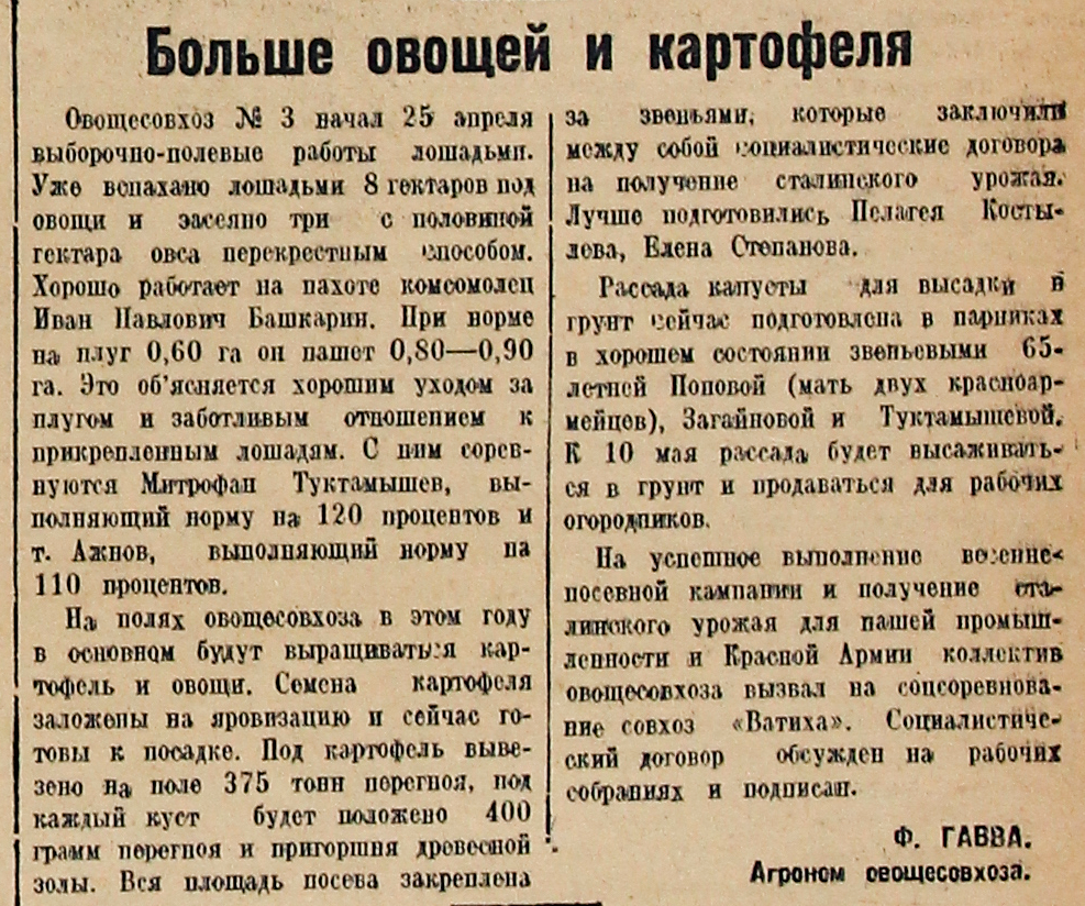 Овощесовхоз № 3 начал 25 апреля выборочно-полевые работы лошадьми. Уже вспахано лошадьми 8 гектаров под овощи и засеяно три с половиной гектара овса перекрестным способом. Хорошо работает на пахоте комсомолец Иван Павлович Башкарин. При норме на плуг 0,60 га он пашет 0,80-0,90 га. Это объясняется хорошим уходом за плугом и заботливым отношением к прикрепленным лошадям. С ним соревнуются Митрофан Туктамышев, выполняющий норму на 120 процентов и т. Ажнов, выполняющий норму на 110 процентов.