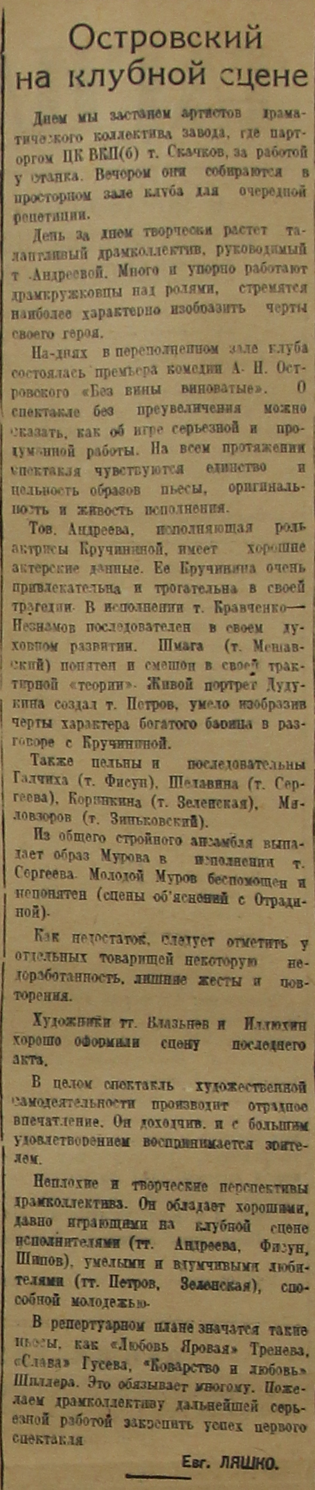 На-днях в переполненном зале клуба состоялась премьера комедии А. Н. Островского «Без вины виноватые». О спектакле без преувеличения можно сказать, как об игре серьезной и продуманной работы. На всем протяжении спектакля чувствуется единство и цельность образов пьесы, оригинальность и живость исполнения.