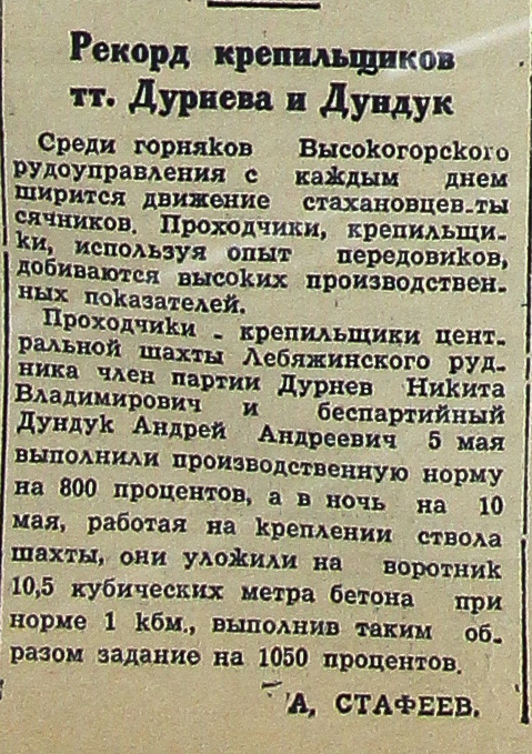 Проходчики-крепильщики центральной шахты Лебяжинского рудника член партии Дурнев Никита Владимирович и беспартийный Дундук Андрей Андреевич 5 мая выполнили производственную норму на 800 процентов, а в ночь на 10 мая, работая на креплении ствола шахты, они уложили на воротник 10,5 кубических метра бетона при норме 1 кбм., выполнив таким образом задание на 1050 процентов.