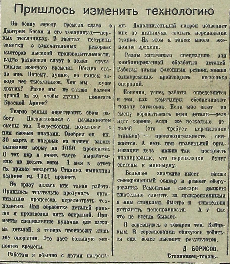 По всему городу гремела слава о Дмитрии Босом и его товарищах – первых тысячниках. В газетах пестрили заметки о замечательных рекордах мастеров высокой производительности, радио разносило славу о делах стахановцев военного времени. Обидно стало мне. Почему, думаю, на нашем заводе нет тысячников. Чем мы хуже других? Разве мы не также болеем душой за то, чтобы лучше помогать Красной Армии?