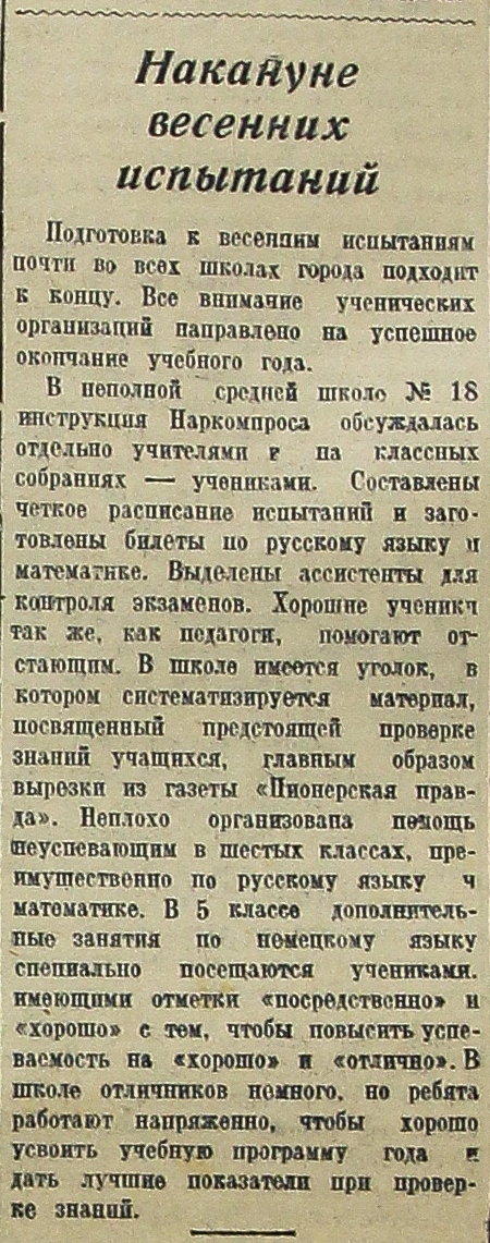 В неполной средней школе № 18 инструкция Наркомпроса обсуждалась отдельно учителями и на классных собраниях – учениками. Составлены четкое расписание испытаний и заготовлены билеты по русскому языку и математике. Выделены ассистенты для контроля экзаменов. Хорошие ученики так же, как педагоги, помогают отстающим. В школе имеется утолок, в котором систематизируется материал, посвященный предстоящей проверке знаний учащихся, главным образом вырезки из газеты «Пионерская правда». Неплохо организована помощь неуспевающим в шестых классах, преимущественно по русскому языку и математике. В 5 классе дополнительные занятия по немецкому языку специально посещаются учениками, имеющими отметки «посредственно» и «хорошо» с тем, чтобы повысить успеваемость на «хорошо» и «отлично». В школе отличников немного, но ребята работают напряженно, чтобы хорошо усвоить учебную программу года и дать лучшие показатели при проверке знаний.