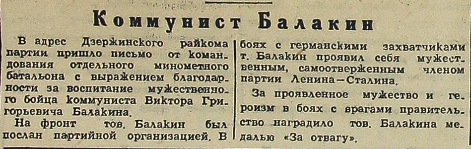 В адрес Дзержинского райкома партии пришло письмо от командования отдельного минометного батальона с выражением благодарности за воспитание мужественного бойца коммуниста Виктора Григорьевича Балакина.