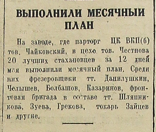 На заводе, где парторг ЦК ВКП(б) тов. Чайковский, в цехе тов. Честнова 20 лучших стахановцев за 12 дней мая выполнили месячный план. Среди них фрезеровщики тт. Данилушкин, Челышев, Болбашов, Казаринов, фронтовая бригада в составе тт. Шляпникова, Зуева, Грекова, токарь Зайцев и другие.