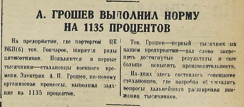 На предприятии, где парторгом ЦК ВКП(б) тов. Гончаров, ширятся ряды пятисотников. Появляются и первые тысячники-стахановцы военного времени. Электрик А. И. Грошев, по-новому организовав процессы, выполнил задание на 1135 процентов.
