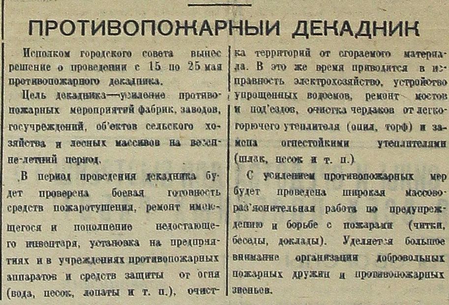 Цель декадника – усиление противопожарных мероприятий фабрик, заводов, госучреждений, объектов сельского хозяйства и лесных массивов на весенне-летний период.