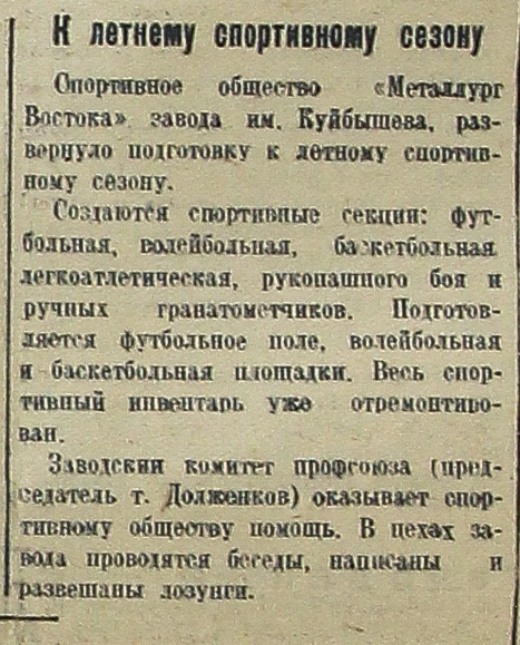 Спортивное общество «Металлург Востока» завода им. Куйбышева, развернуло подготовку к летнему спортивному сезону.