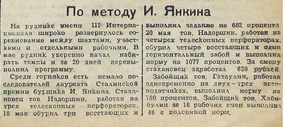 Среди горняков есть немало последователей лауреата Сталинской премии бурщика И. Янкина. Стахановец тов. Надоршин, работая на трех телескопных перфораторах, 18 мая обурил три восстающих и выполнил задание на 682 процента. 20 мая тов. Надоршин, работая на четырех телескопных перфораторах, обурил четыре восстающих и один горизонтальный забой и выполнил норму на 1077 процентов. За смену стахановец заработал 628 рублей.