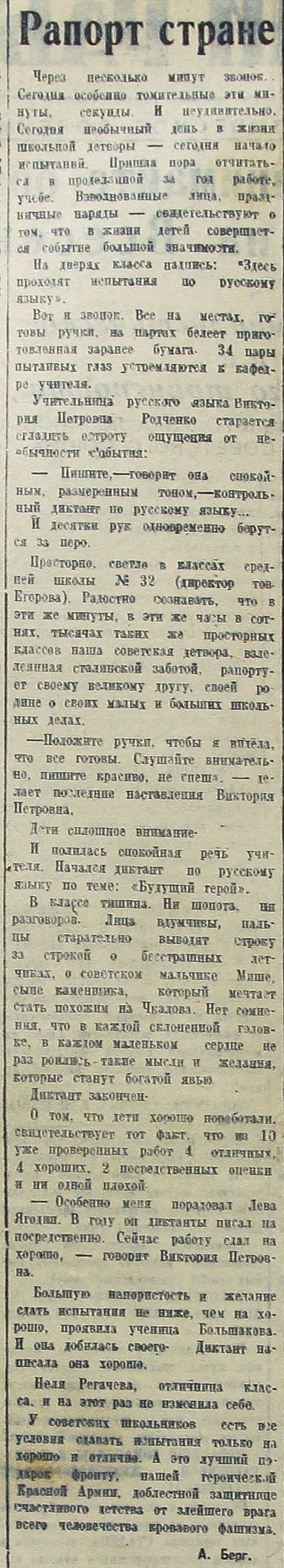Просторно, светло в классах средней школы № 32 (директор тов. Егорова). Радостно сознавать, что в эти же минуты, в эти же часы в сотнях, тысячах таких же просторных классов наша советская детвора, взлелеянная сталинской заботой, рапортует своему великому другу, своей родине о своих малых и больших школьных делах.