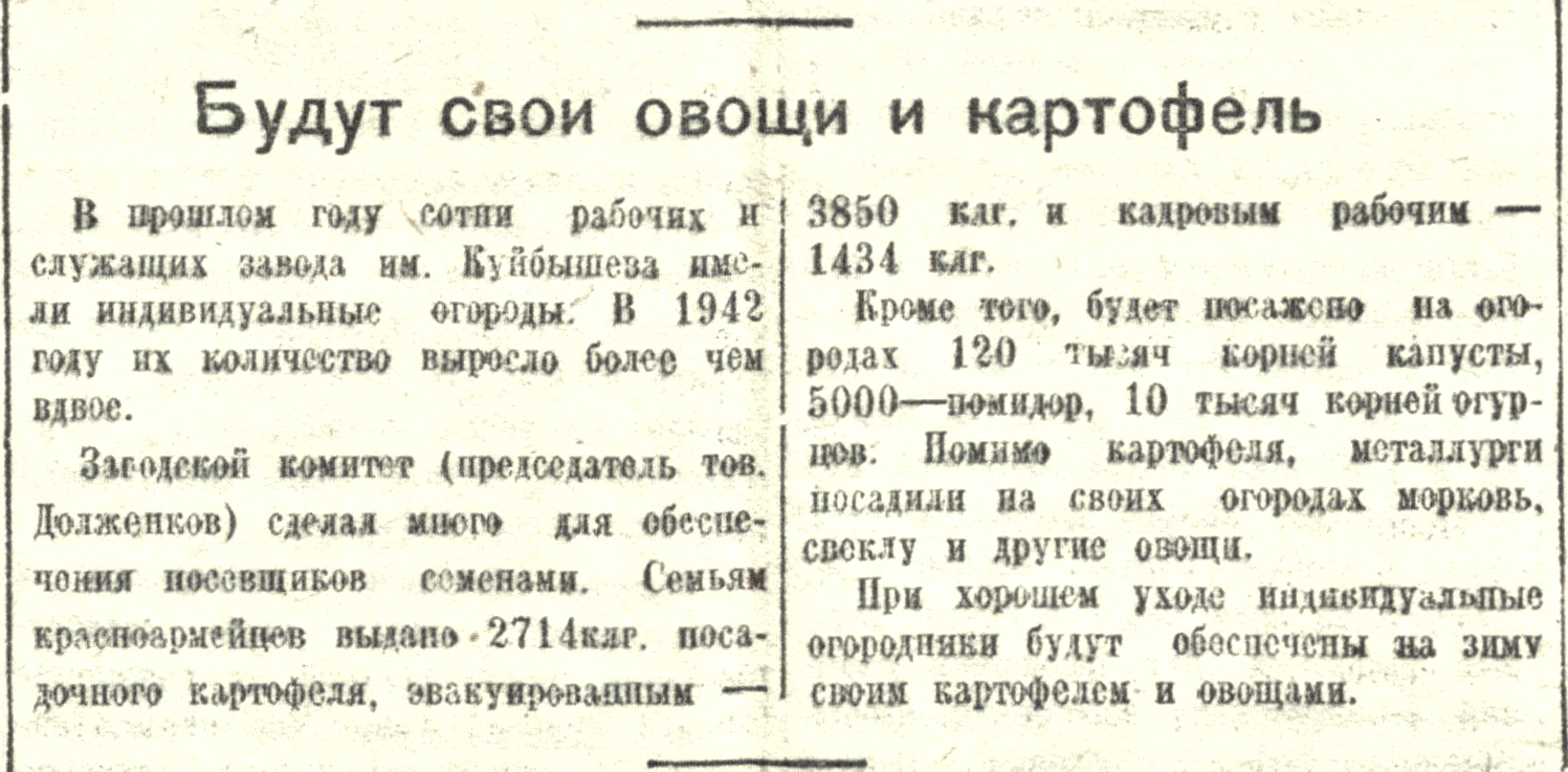 В прошлом году сотни рабочих и служащих завода им. Куйбышева имели индивидуальные огороды. В 1942 году их количество выросло более чем вдвое.