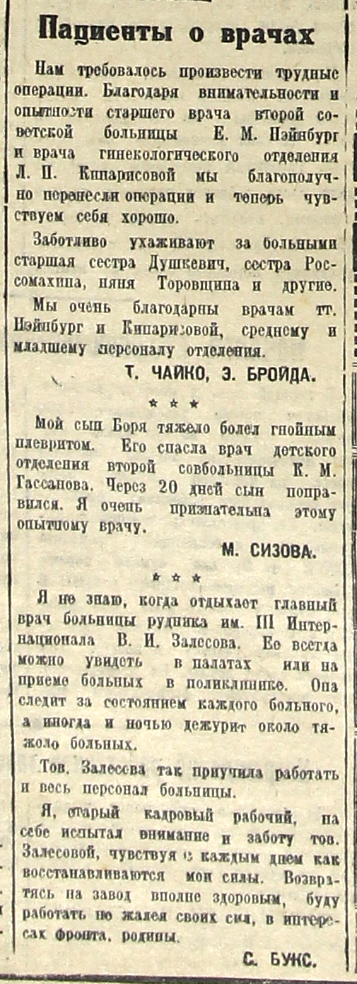 Нам требовалось провести трудные операции. Благодаря внимательности и опытности старшего врача второй советской больницы Е. М. Нэйнбурги, врача гинекологического отделения Л. П. Кипарисовой, мы благополучно перенесли операции и теперь чувствуем себя хорошо.