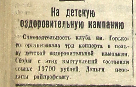 Самодеятельность клуба им. Горького организовала три концерта в пользу детской оздоровительной кампании. Сборы с этих выступлений составили свыше 13700 рублей. Деньги передали райпрофсожу.
