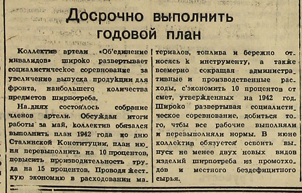 На днях состоялось собрание членов артели. Обсуждая итоги работы за май, коллектив обязался выполнить план 1942 года ко дню Сталинской Конституции, план июня перевыполнить на 10 процентов, повысить производительность труда на 15 процентов. Проводя жесткую экономию в расходовании материалов, топлива и бережно относясь к инструменту, а также всемерно сокращая административные и производственные расходы, сэкономить 10 процентов от смет, утвержденных на 1942 год. Широко развертывая социалистическое соревнование, добиться того, чтобы все рабочие выполняли и перевыполняли нормы. В июне коллектив обязуется освоить выпуск не менее двух новых видов изделий ширпотреба из промотходов и местного бездефицитного сырья.