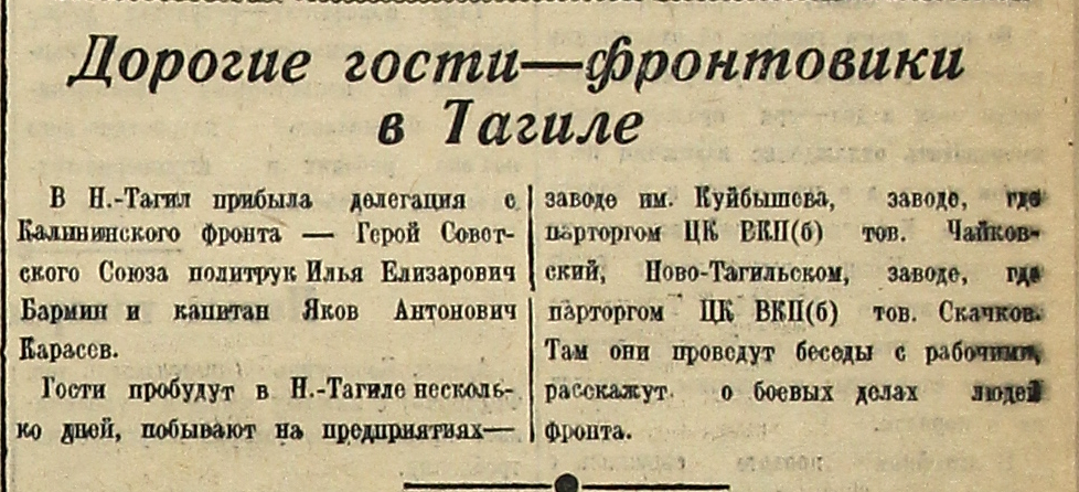 Гости пробудут в Н.-Тагиле несколько дней, побывают на предприятиях –заводе им. Куйбышева, заводе, где парторгом ЦК ВКП(б) тов. Чайковский, Ново-Тагильском, заводе, где парторгом ЦК ВКП(б) тов. Скачков. Там они проведут беседы с рабочими, расскажут о боевых делах людей фронта.