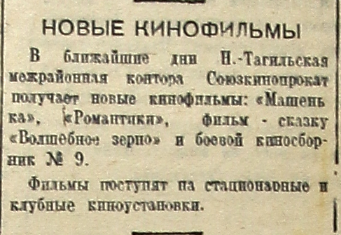 В ближайшие дни Н.-Тагильская межрайонная контора Союзкипопрокат получает новые кинофильмы: «Машенька», «Романтики», фильм-сказку «Волшебное зерно» и боевой киносборник № 9.