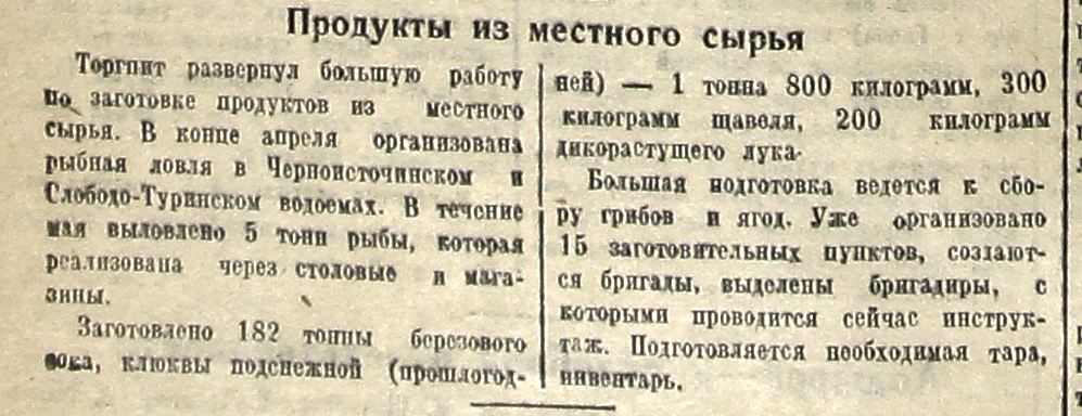 Торгпит развернул большую работу по заготовке продуктов из местного сырья. В конце апреля организована рыбная ловля в Черноисточинском и Слободо-Туринском водоемах. В течение мая выловлено 5 тонн рыбы, которая реализована через столовые и магазины.
