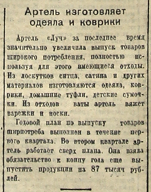 Артель «Луч» за последнее время значительно увеличила выпуск товаров широкого потребления, полностью используя для этого имеющиеся отходы. Из лоскутков ситца, сатина и других материалов изготовляются одеяла, коврики, домашние туфли, детские сумочки. Из отходов ваты артель вяжет варежки и носки.