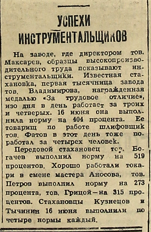 На заводе, где директором тов. Максарев, образцы высокопроизводительного труда показывают инструментальщики. Известная стахановка, первая тысячница завода тов. Владимирова, награжденная медалью «За трудовое отличие», изо дня в день работает за троих и четверых. 16 июня она выполнила норму на 404 процента. Ее товарищ по работе шлифовщик тов. Фатов в этот день тоже поработал за четырех человек.