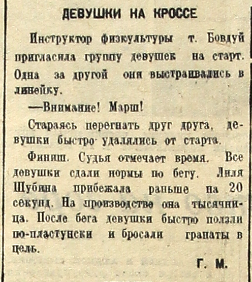 Стараясь перегнать друг друга, девушки быстро удалялись от старта. Финиш. Судья отмечает время. Все девушки сдали нормы по бегу. Лиля Шубина прибежала раньше на 20 секунд. На производстве она тысячница. После бега девушки быстро ползли по-пластунски и бросали гранаты в цель. Г. М.