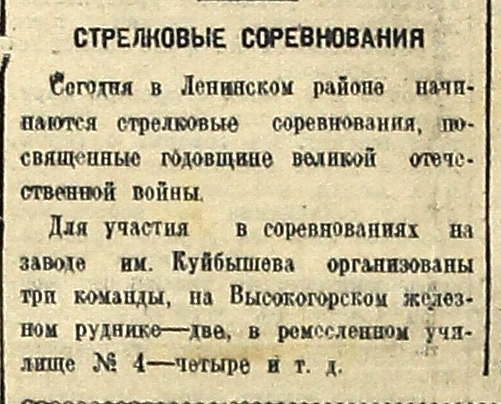 Для участия в соревнованиях на заводе им. Куйбышева организованы три команды, на Высокогорском железном руднике – две, в ремесленном училище № 4 – четыре и т. д.