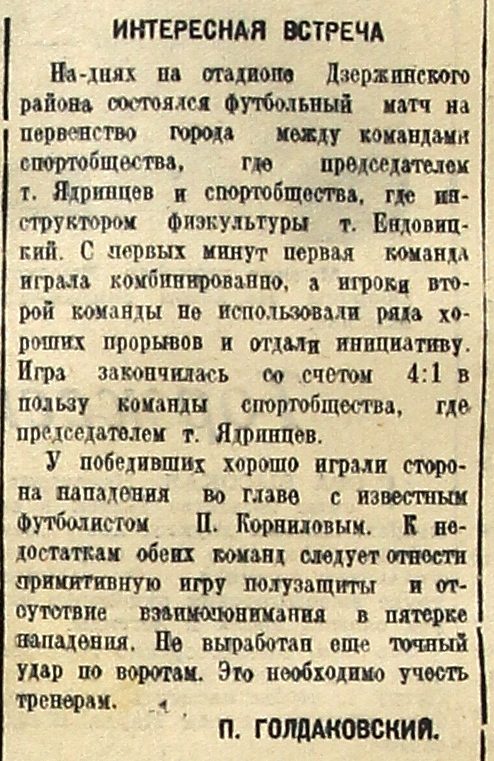 На-днях на стадионе Дзержинского района состоялся футбольный матч на первенство города между командами спортобщества, где председателем т. Ядринцев и спортобщества, где инструктором физкультуры т. Ендовицкий. С первых минут первая команда играла комбинированно, а игроки второй команды не использовали ряда хороших прорывов и отдали инициативу. Игра закончилась со счетом 4:1 в пользу команды спортобщества, где председателем т. Ядринцев.