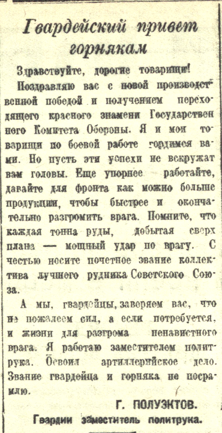 А мы, гвардейцы, заверяем вас, что не пожалеем сил, а если потребуется, и жизни для разгрома ненавистного врага. Я работаю заместителем политрука. Освоил артиллерийское дело. Звание гвардейца и горняка не посрамлю.
