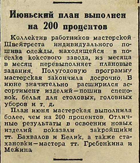 Коллектив работников мастерской Швейтреста индивидуального пошива одежды, находящейся в поселке коксового завода, из месяца в месяц перевыполняет плановые задания. Полугодовую программу мастерская закончила досрочно. В июне значительно расширился ассортимент изделий – пошив спецовок, белья для столовых, головных уборов и т. д.