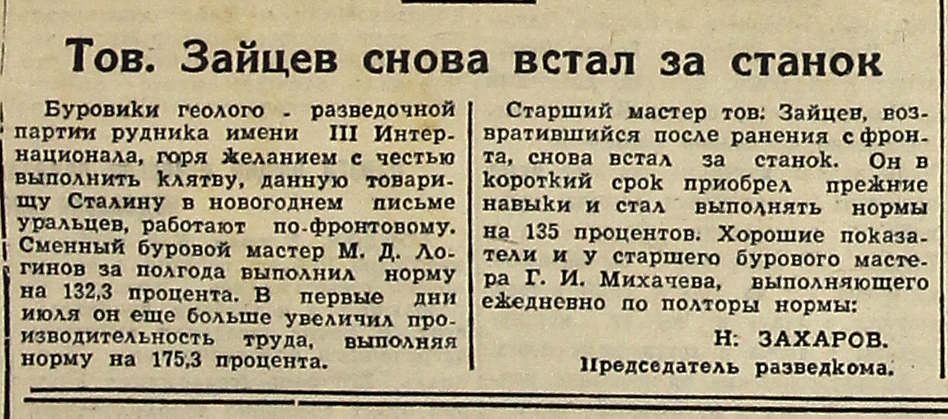 Буровики геолого-разведочной партии рудника имени III Интернационала, горя желанием с честью выполнить клятву, данную товарищу Сталину в новогоднем письме уральцев, работают по-фронтовому. Сменный буровой мастер М. Д. Логинов за полгода выполнил норму на 132,3 процента. В первые дни июля он еще больше увеличил производительность труда, выполняя норму на 175,3 процента.