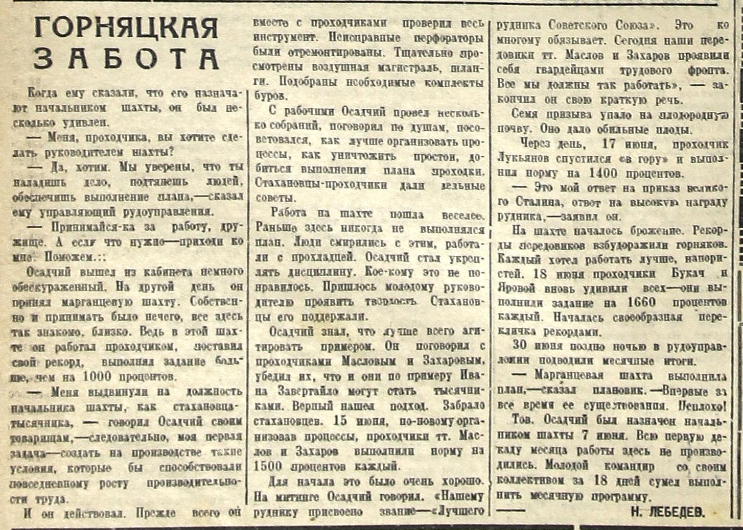Через день, 17 июня, проходчик Лукьянов спустился «в гору» и выполнил норму на 1400 процентов.