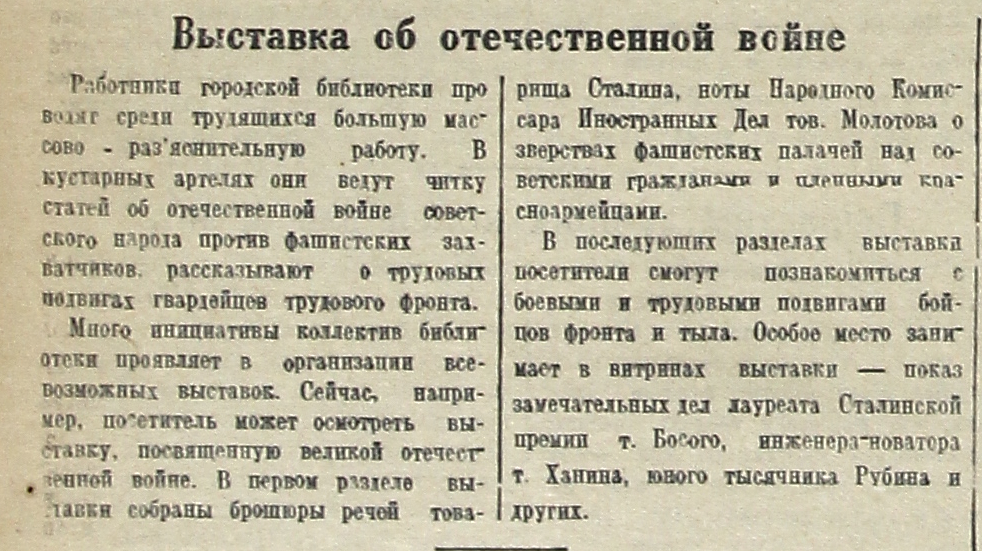 Много инициативы коллектив библиотеки проявляет в организации всевозможных выставок. Сейчас, например, посетитель может осмотреть выставку, посвященную великой отечественной войне. В первом разделе выставки собраны брошюры речей товарища Сталина, ноты Народного Комиссара Иностранных Дел тов. Молотова о зверствах фашистских палачей над советскими гражданами и пленными красноармейцами.