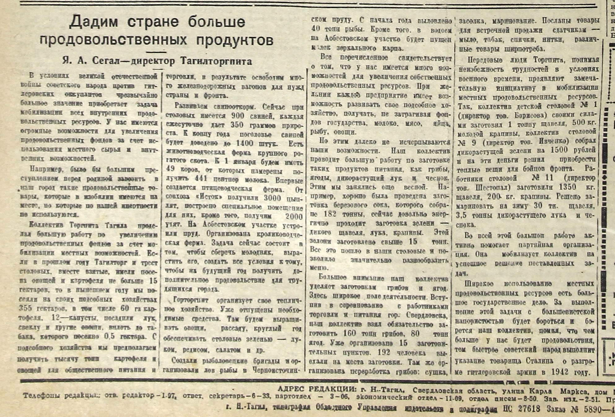 Коллектив Торгпита Тагила проделал большую работу по увеличению продовольственных фондов за счет мобилизации местных возможностей. Если в прошлом году Тагилторг и трест столовых, вместе взятые, имели посева овощей и картофеля не больше 15 гектаров, то в нынешнем году мы посеяли на своих подсобных хозяйствах 355 гектаров, в том числе 60 га картофеля. 12 – капусты, посадили лук, свеклу и другие овощи, вплоть до табака, которого посеяно 0.5 гектара. С подсобного хозяйства мы предполагаем получить тысячу тонн картофеля овощей для общественного питания и торговли, в результате освободим много железнодорожных вагонов для нужд страны и фронта.