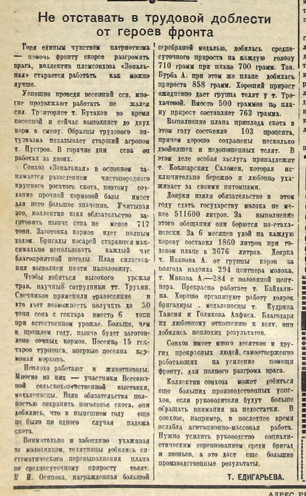 Совхоз имеет много десятков и других прекрасных людей, самоотверженно работающих на усиление помощи фронту, для полного разгрома врага.