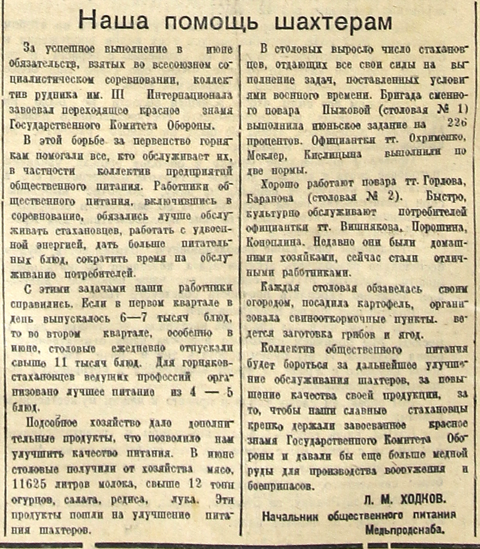Коллектив общественного питания будет бороться за дальнейшее улучшение обслуживания шахтеров, за повышение качества своей продукции, за то, чтобы наши славные стахановцы крепко держали завоеванное красное знамя Государственного Комитета Обороны и давали бы еще больше медной руды для производства вооружения и боеприпасов.