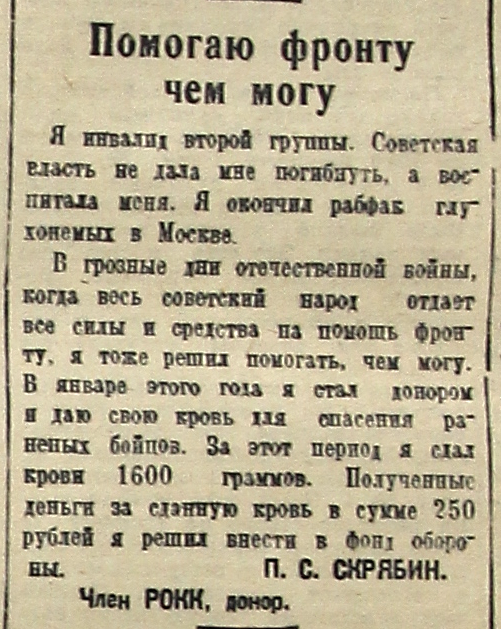 В грозные дни отечественной войны, когда весь советский народ отдает все силы и средства на помощь фронту, я тоже решил помогать, чем могу. В январе этого года я стал донором, я даю свою кровь для спасения раненых бойцов. За этот период я сдал крови 1600 граммов. Полученные деньги за сданную кровь в сумме 250 рублей я решил внести в фонд обороны.