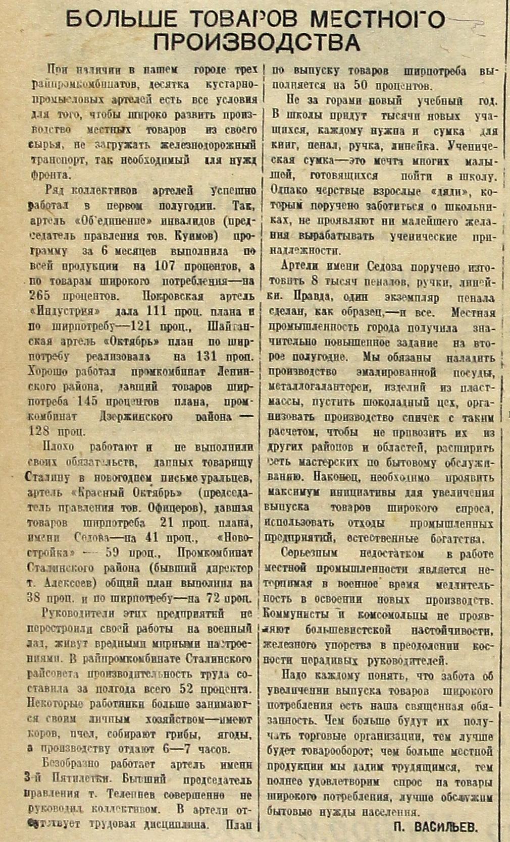 При наличии в нашем городе трех райпромкомбинатов, десятка кустарно- промысловых артелей есть все условия для того, чтобы широко развить производство местных товаров из своего сырья, не загружать железнодорожный транспорт, так необходимый для нужд фронта.