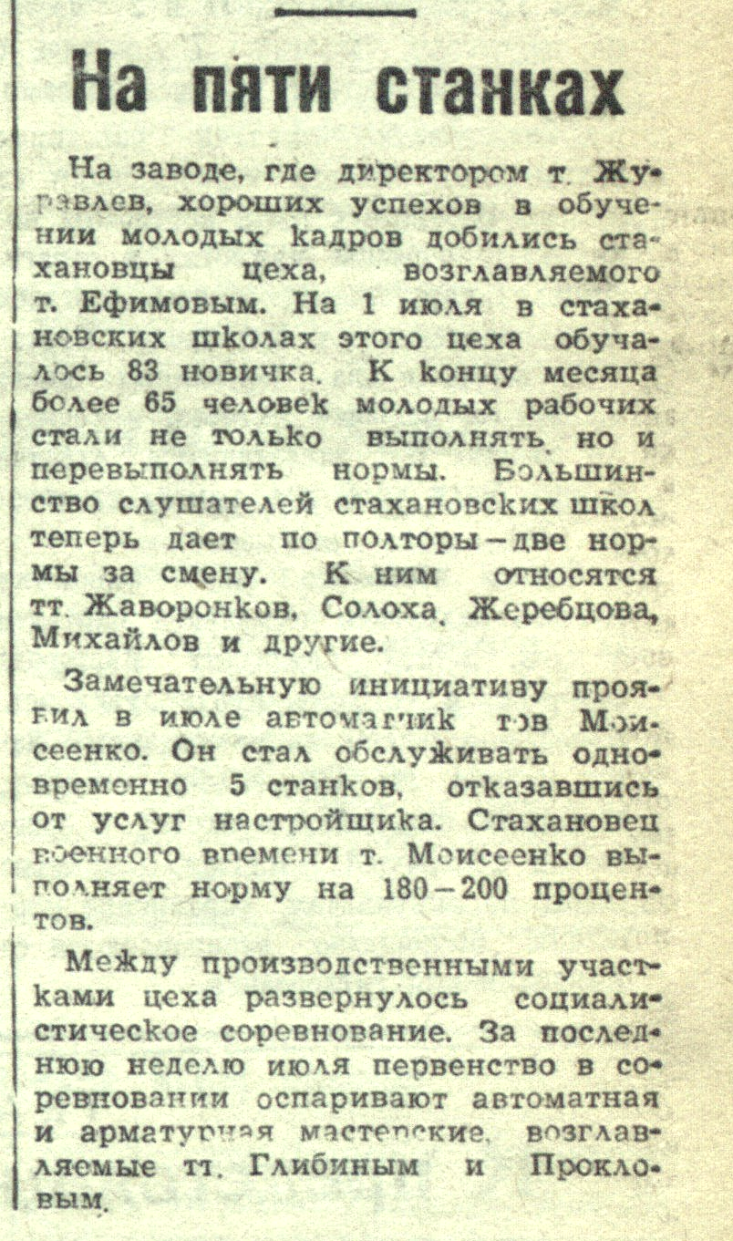 Замечательную инициативу проявил в июле автоматчик тов. Моисеенко. Он стал обслуживать одновременно 5 станков, отказавшись от услуг настройщика. Стахановец военного времени т. Моисеенко выполняет норму на 180-200 процентов.