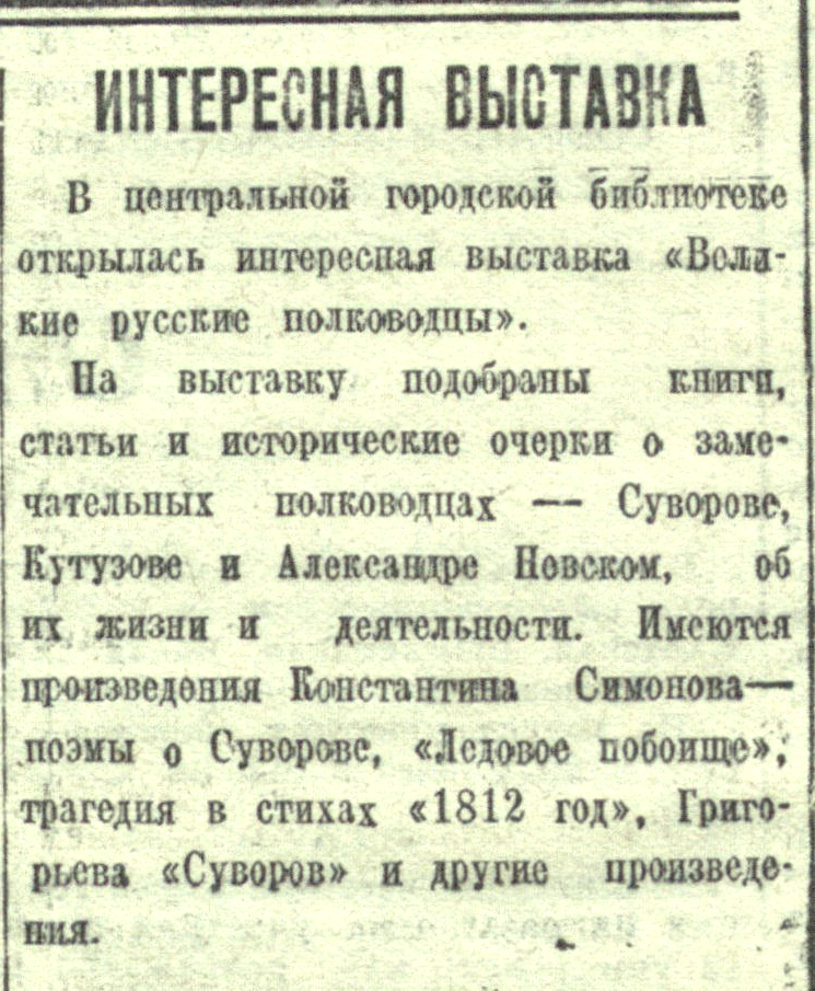 На выставку подобраны книги, статьи и исторические очерки о замечательных полководцах – Суворове, Кутузове и Александре Невском, об их жизни и деятельности. Имеются произведения Константина Симонова – поэмы о Суворове, «Ледовое побоище», трагедия в стихах «1812 год», Григорьева «Суворов» и другие произведения.